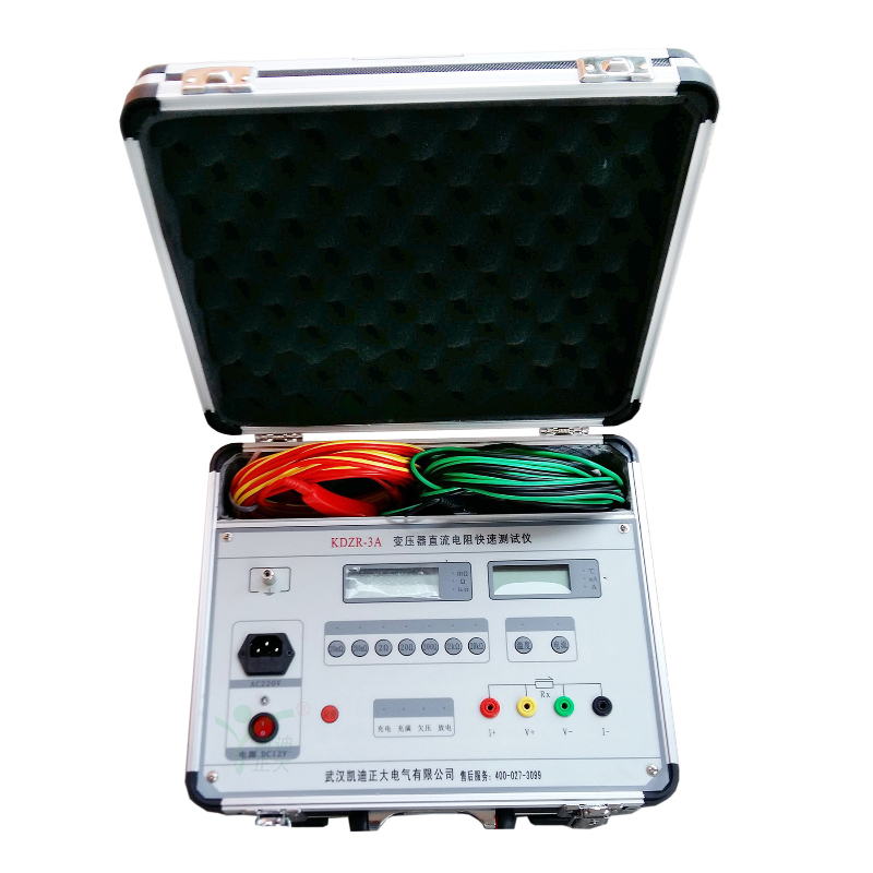 KDZR-3A直流電阻測試儀(微歐計)是取代直流單、雙臂電橋的高精度換代產(chǎn)品。儀器采用了先進的開關電源技術,由四位半LCD液晶顯示測量結果??朔似渌惍a(chǎn)品由LED顯示值在陽光下不便讀數(shù)的缺點,同時具備了自動消弧功能。本儀器具有測速快、精度高、顯示直觀、抗干擾能力強、體積小、耗電省、測試數(shù)據(jù)穩(wěn)定可靠、不受人為因素影響等優(yōu)點。是測量電力變壓器及大型電機等各種感性負載電阻及低壓開關接觸電阻、電線電纜或焊縫接口電阻的理想儀器,其測量速度比電橋快一百多倍。儀器內(nèi)裝可充電電池組(12V),交、直流兩用,便于現(xiàn)場及野外測試。