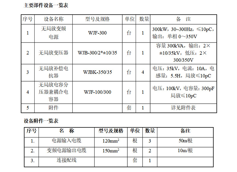 (1)設(shè)備型號(hào)及名稱: WJF-300kW無局放感應(yīng)耐壓試驗(yàn)裝置