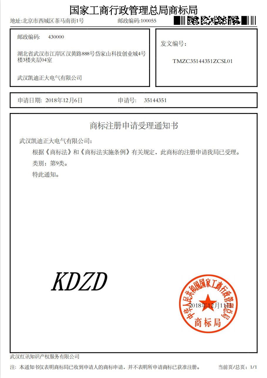 ![]() “KDZD”國(guó)家工商行政總局商標(biāo)局受理書 |