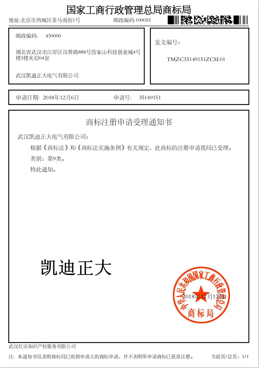 ![]() “凱迪正大”國(guó)家工商行政總局商標(biāo)局受理書 |
