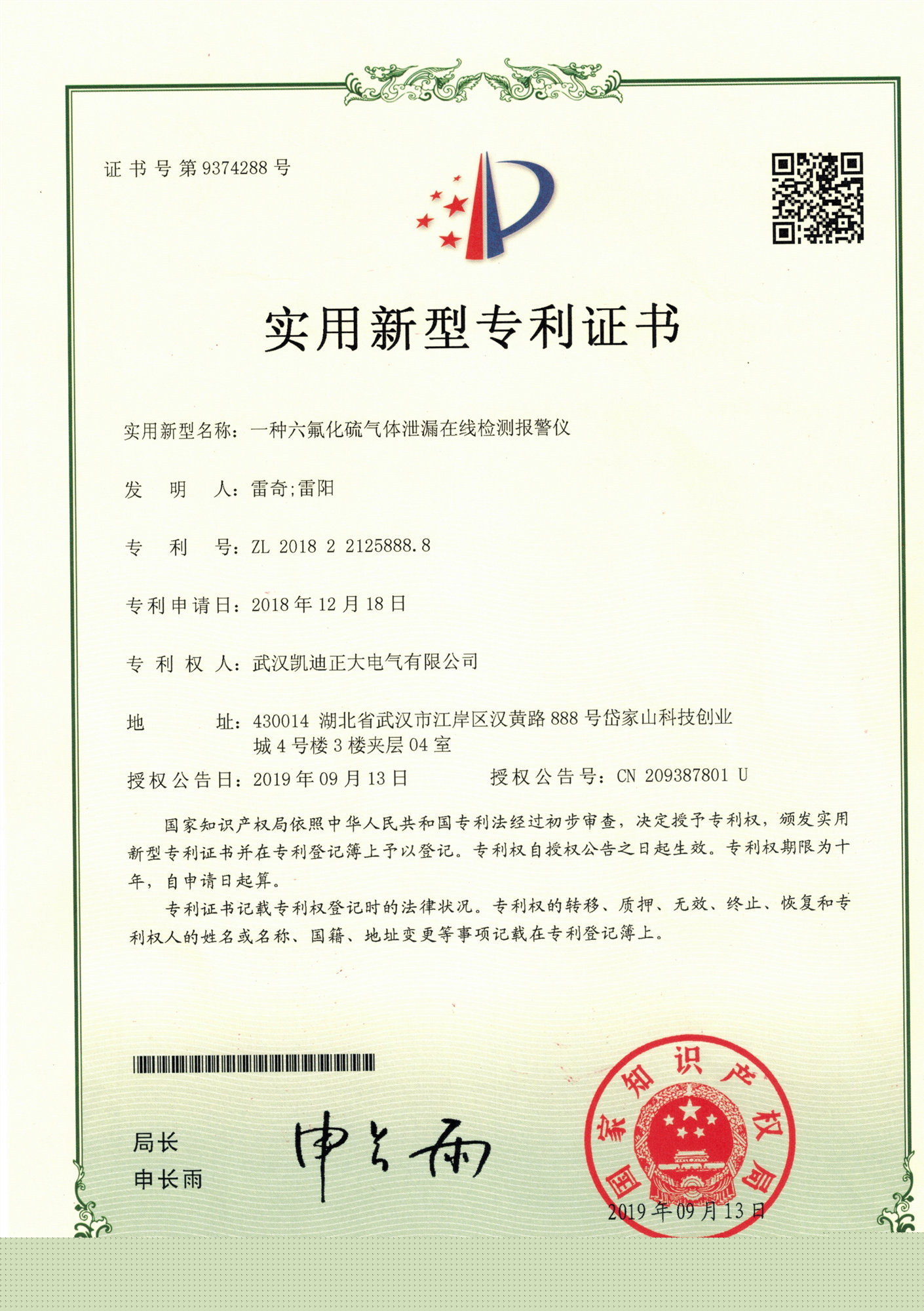 ![]() “KDXJ-8六氟化硫氣體泄漏報(bào)警系統(tǒng)”曾獲實(shí)用新型專利證書 |