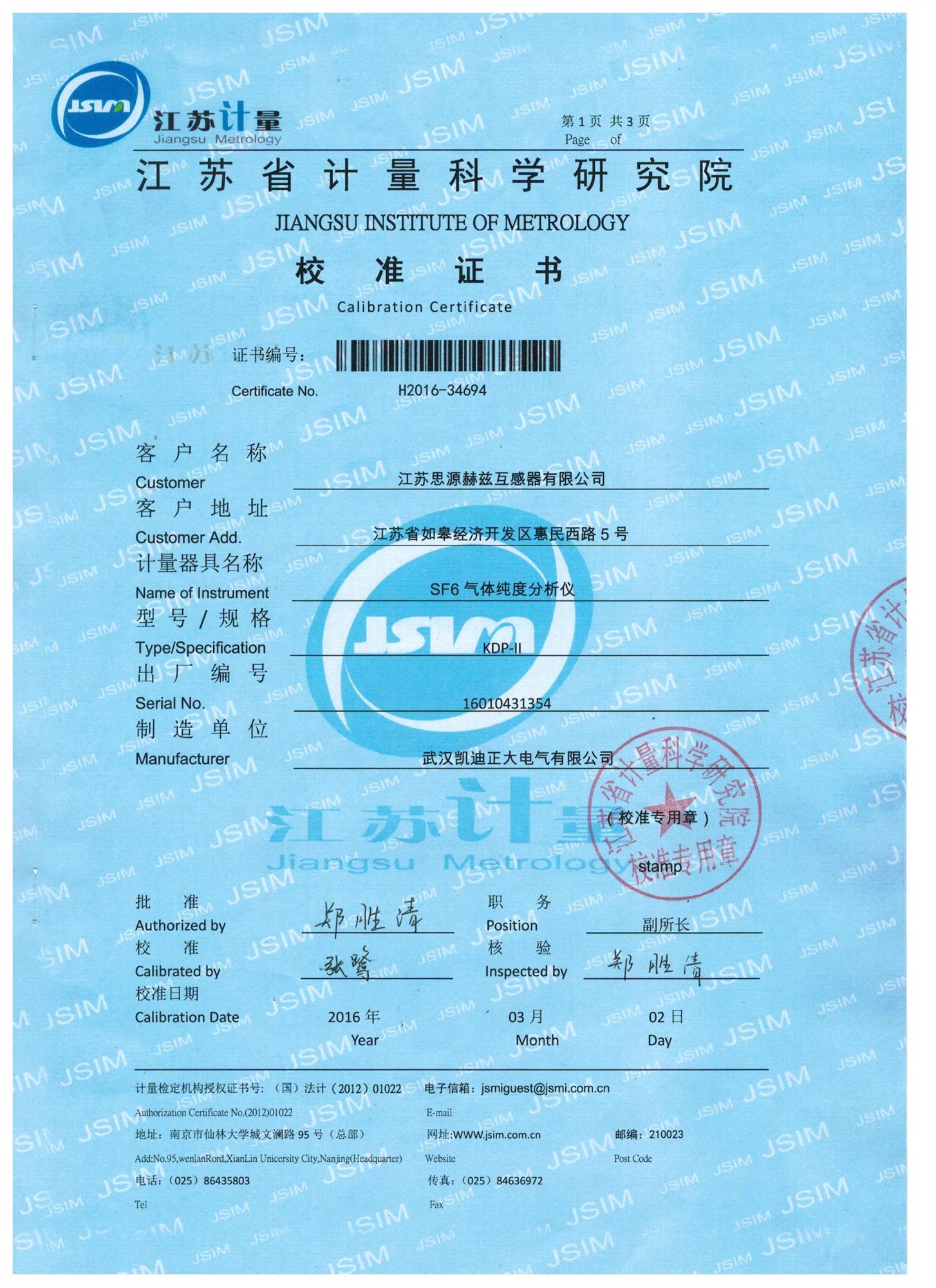 ![]() 江蘇省計(jì)量科學(xué)研究院-SF純度分析儀校準(zhǔn)證書 |
