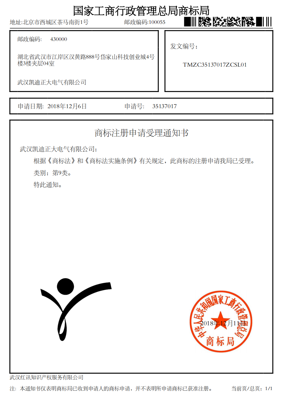 ![]() “凱迪正大LOGO”國(guó)家工商行政總局商標(biāo)局受理書 |
