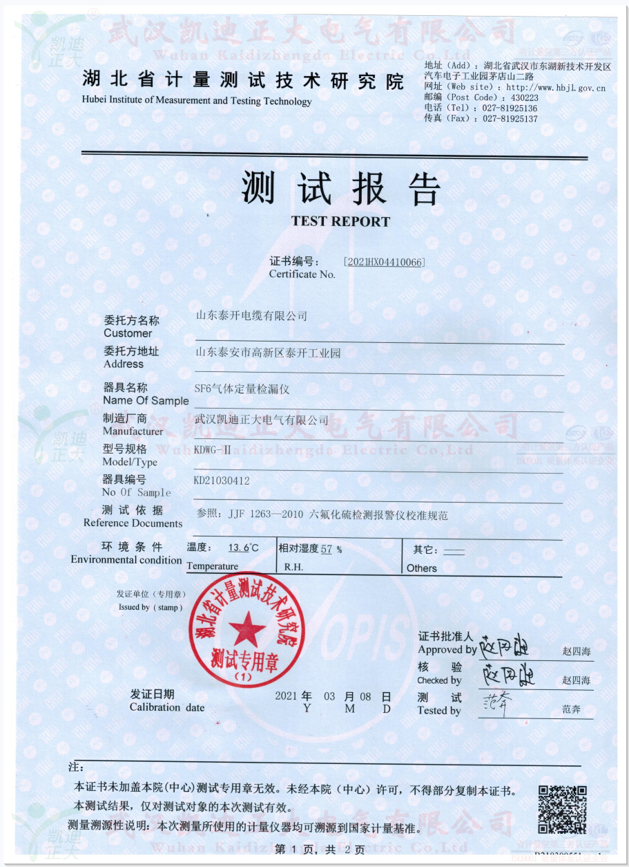 泰開電纜從事輸變電設(shè)備制造、低壓電器、專用汽車等多種行業(yè)的大型企業(yè)集團(tuán)。在輸變電行業(yè)具備了研發(fā)、生產(chǎn)與銷售550千伏及以下電壓等級輸配電設(shè)備總成套供貨、電站工程項目總承包建設(shè)的能力。需要六氟化硫的檢測設(shè)備,這次采購的KDWG-II型SF6氣體定量檢漏儀用于設(shè)備的SF6氣體檢漏,我們?yōu)槠渫扑]了KDQH-12Y-54-150L氣體回收凈化裝置、KDQC-33氣體抽真空充氣裝置等設(shè)備。采購的設(shè)備須有湖北省計量院的測試報告,這次獲得計量院測試報告。