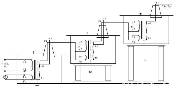 三臺試驗變壓器串級使用,例如上述型號分別是10kVA/50kV、5kVA/50kV、3kVA/50kV,那么三臺容量之比就是3:2:1,總?cè)萘客瑯右彩堑谝患壴囼炞儔浩魅萘?0kVA,而總電壓就是三臺試驗變壓器的電壓之和,也就是說總電壓輸出為150kV。