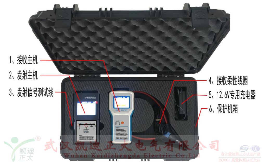 KD-214A帶電電纜識別儀(以下簡稱識別儀)是用于將某一特定電纜從一束電纜中識別出來的專用儀器。它即能識別停電電纜,也能識別帶電電纜,滿足了電力施工現(xiàn)場對電纜識別的多重需求。識別儀主要由發(fā)射主機、接收主機、發(fā)射連線、發(fā)射卡鉗與柔性測量線圈構(gòu)成。識別儀的設計相比上一代產(chǎn)品更加緊湊小巧,攜帶方便,具有如下特點: