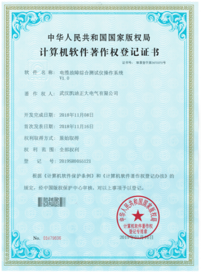 2019年,武漢凱迪正大電氣有限公司新力之作,榮獲中華人民共和國國家版權局《計算機軟件著作權登記證書》系統(tǒng)計算機軟件著作登記以及質量管理體系認證證書,其中包含電纜故障綜合測試儀操作系統(tǒng)V1.0(證書號:軟著登字第3475878號)、氧化鋅避雷器帶電測試儀操作系統(tǒng)V1.0(證書號:軟著登字第3478045號)、高壓開關動作特性測試儀操作系統(tǒng)V1.0(證書號:軟著登字第3478053號)、變頻串聯(lián)諧振耐壓試驗裝置操作系統(tǒng)V1.0(證書號:軟著登字第3475581號)、電纜震蕩波局放定位系統(tǒng)操作系統(tǒng)V1.0(證書號:軟著登字第3475874號)等證書共計5份。權利取得方式:原始取得。權利范圍:全部范圍。
