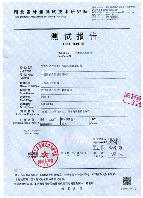 武漢凱迪正大KDHX-35無(wú)線高壓核相器校驗(yàn)證書