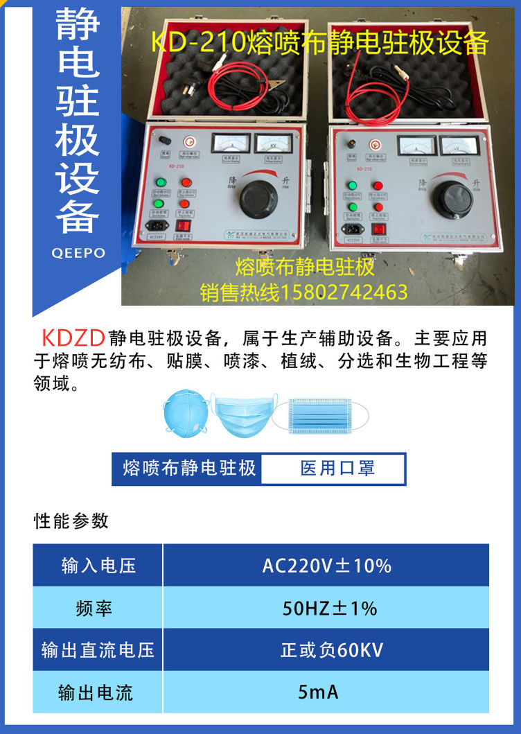 KDZD5020熔噴布靜電駐極設(shè)備參數(shù): 高壓輸出:自動(dòng)聲壓 恒壓輸出 安全措施:自動(dòng)檢測(cè)電流變化,反折保護(hù)電路特性 輸入電壓:220VAC,50Hz 輸出電壓:DC 0-120KV,負(fù)極性,輸出功率:200W-30000W可以定制,輸出電流2mA-10000mA可以定制??烧{(diào)故障處理:過(guò)電壓,過(guò)電流自動(dòng)跳脫 適用環(huán)境:0-40攝氏度。