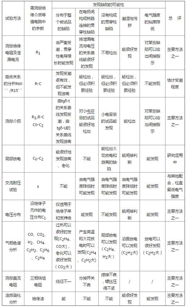 從表中可見,每種試驗方法都只能發(fā)現(xiàn)某一方面的絕緣缺陷,因此,單靠一種試驗方法,有時很難判斷絕緣好壞,須根據(jù)各種試驗方法的特點和試驗結果,相互比較與補充,力求作出準確的判斷。這就要求我們在實際工作中,掌握各種試驗方法,注意提高綜合試驗分析的能力。