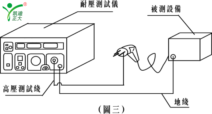 按圖三將耐壓儀與被測整機(jī)連接,接通被測整機(jī)電源開關(guān),根據(jù)被測整機(jī)產(chǎn)品標(biāo)準(zhǔn)設(shè)置漏電流報警值,然后再按4條或5條所進(jìn)行測試。如若被測整機(jī)產(chǎn)品標(biāo)準(zhǔn)沒有規(guī)定具體漏電流報警值,則推薦按下式計(jì)算:Iz=Kp(U/R)...............(1)