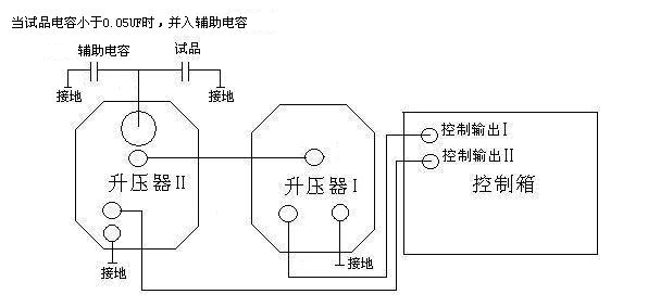 (2)I號升壓器和II號升壓器串聯(lián)使用(試驗(yàn)電壓≤80KV)連線方法