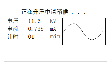 按退出鍵顯示20組歷史數(shù)據(jù),將光標(biāo)移到“啟動(dòng)試驗(yàn)電壓”按確定鍵,儀器進(jìn)入圖6所示的升壓界面。