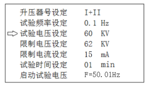 - 升壓器號設(shè)定:如果使用I號升壓器單獨(dú)升壓,升壓器號設(shè)定為I號(此時(shí)試驗(yàn)電壓設(shè)定≤30KV),如果使用I號升壓器和II號升壓器串聯(lián)升壓,升壓器號設(shè)定為I+II號。