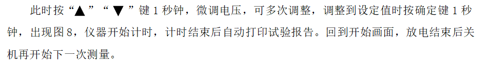 ★另外還有兩種非正常停機(jī):過壓保護(hù)停機(jī)、過流保護(hù)停機(jī)。停機(jī)后出現(xiàn)相應(yīng)的提示界面,放電結(jié)束后,再調(diào)整限制電壓值或限制電流值,再開始下次測量。