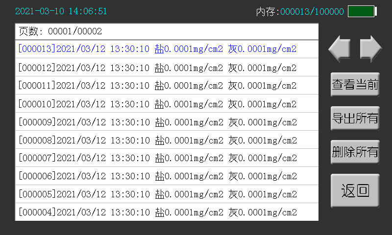 鹽密基準(zhǔn)值:在測(cè)量頁(yè)點(diǎn)“校準(zhǔn)”按鈕后會(huì)自動(dòng)保存溶液的初始鹽密值作為“鹽密基準(zhǔn)值”,也可以用戶(hù)自定義。