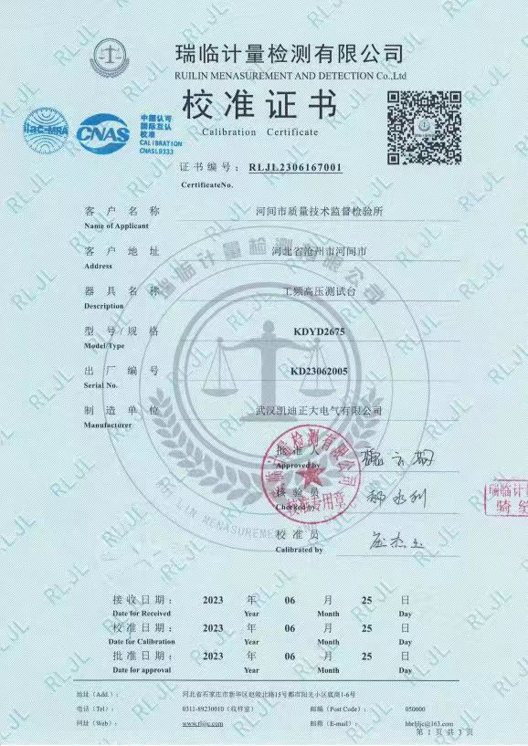 河間市質(zhì)量技術(shù)監(jiān)督檢驗(yàn)所采購我司KDYD2675 工頻高壓測(cè)試臺(tái),應(yīng)技術(shù)要求送第三方檢測(cè)機(jī)構(gòu)瑞臨計(jì)量檢測(cè)有限公司檢定。
