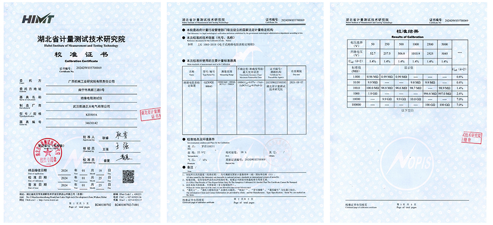 2024年1月25日,廣西機(jī)械工業(yè)研究院有限責(zé)任公司成功采購了凱迪正大電氣的KD305A 絕緣電阻測試儀、KD2575 耐壓測試儀、KD2678 30A接地電阻測試儀、KDGK-F 開關(guān)特性測試儀等電力儀器儀表,均通過權(quán)威的湖北省計(jì)量測試技術(shù)研究院的嚴(yán)格校準(zhǔn)。