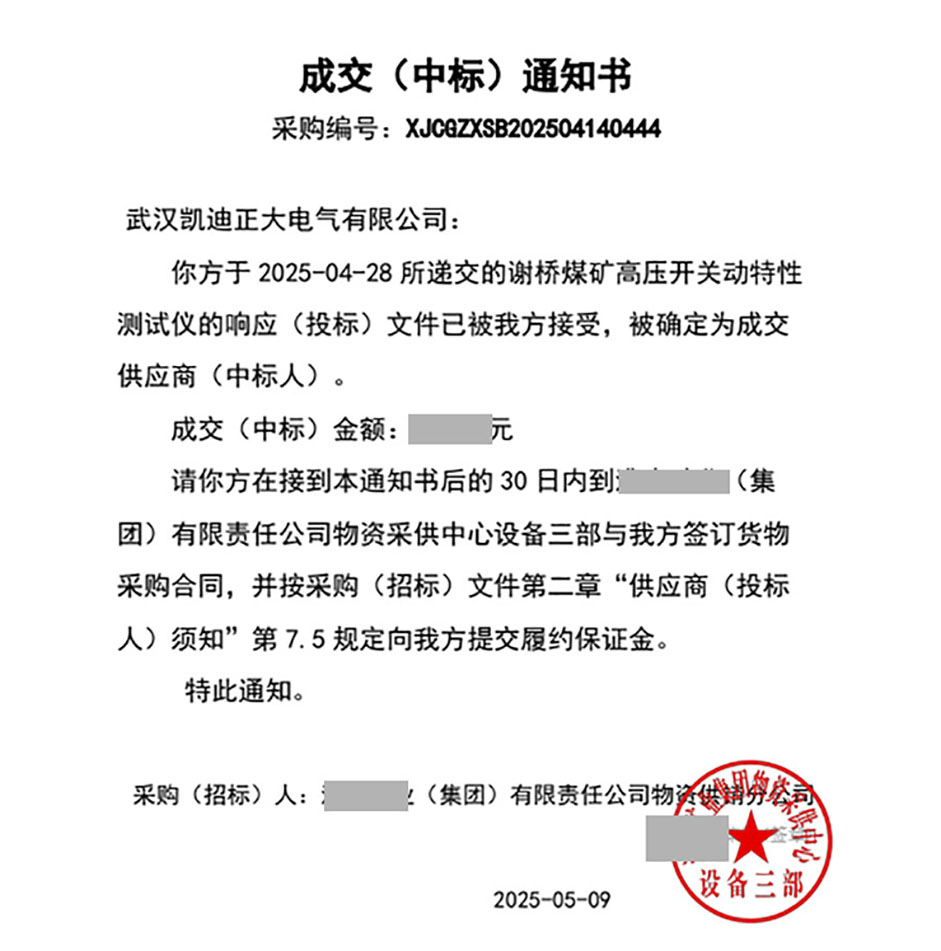 恭喜武漢凱迪正大成功中標(biāo)淮南某集團高壓開關(guān)動特性測試儀項目