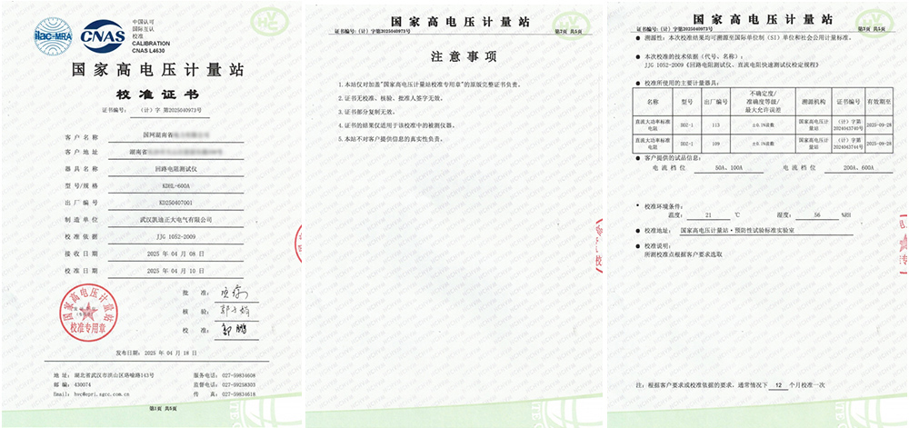 近日,國(guó)網(wǎng)湖南省某有限公司采購的武漢凱迪正大KDHL-600A回路電阻測(cè)試儀,順利通過了國(guó)家高電壓計(jì)量站的嚴(yán)格校準(zhǔn),并獲得了校準(zhǔn)證書。
