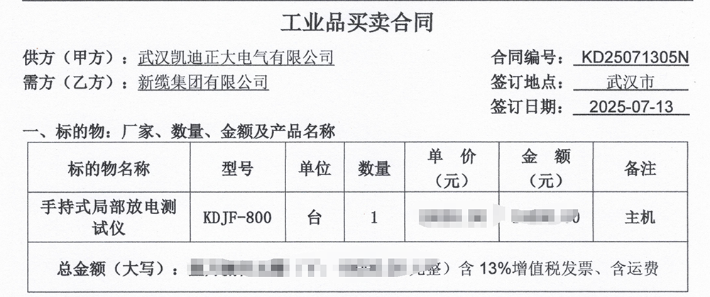 2025年7月13日,電力設(shè)備制造商新纜集團有限公司采購了武漢凱迪正大電氣有限公司的KDJF-800局部放電檢測儀,這彰顯了武漢凱迪正大在局部放電檢測領(lǐng)域的專業(yè)實力和市場地位。